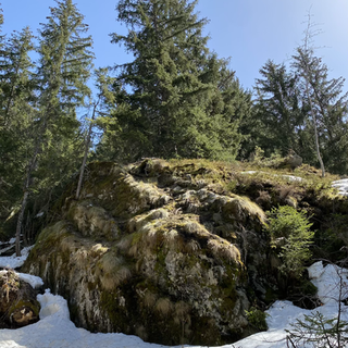 Etwas oberhalb vom Zentrum Blatten startet man mit einer kleinen Holzbrücke über den Bach Bruchi. Der Wanderweg folgt dem Waldrand entlang, mit einer leichten Steigung immer tiefer zwischen die Felsen. Rasch ist man in einer leicht mystischen Landschaft mit Steinen, Eis und moosigen Flächen. In der Frühlingssonne schmilzt der Schnne langsam vor sich hin und entsehen kleinere Bächlein am Rande des Weges.